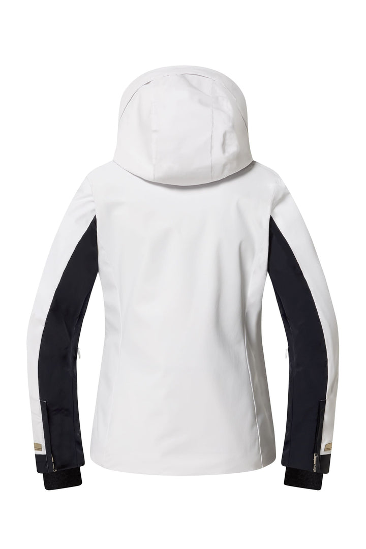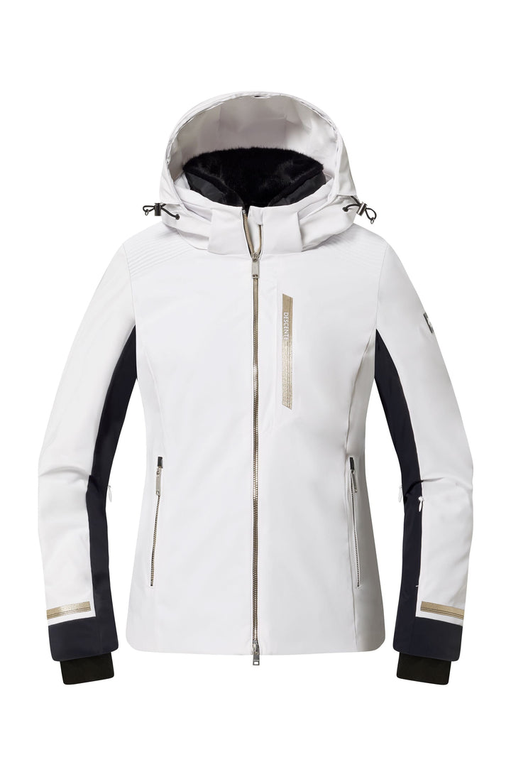 Jacket with Shoulder Shirring for Cushioning when carrying skis. A feminine sporty touch has been added with on trend lamé jacquard line printed next to the chest pocket and on the sleeves. It has a rich metallic style EXCELLA zipper, the upper part of which docks under a tab featuring a Descente logo. The collar has a new, removable inner boa both for warmth and easy laundering and there is a detachable faux fur trim for the hood. This season’s updates have added a touch of luxury.
